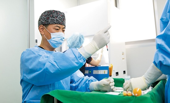 신동진 원장이 ‘줄기세포 가슴성형’을 위해 건강한 지방세포만을 골라 줄기세포를 추출한 뒤 지방과 혼합하고 있는 모습. / SC301성형외과 제공