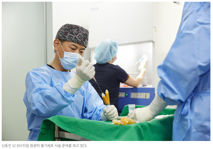 다만 아무리 줄기세포 효과가 좋더라도 한번에 필요한 세포를 손상되지 않게 충분히 채취할 수 있는 장비를 갖추고 이를 제대로 다룰 수 있는 의료진의 임상 경험이 뒷받침돼야 한다는 게 그의 지적이다. 신 원장은 “환자의 몸에서 지방을 채취하고 줄기세포를 추출한 뒤 2시간 안에 시술하지 않으면 줄기세포가 소멸되기 시작하므로 시술이 늦어지면 줄기세포를 주입하는 의미가 없어진다”고 지적했다.