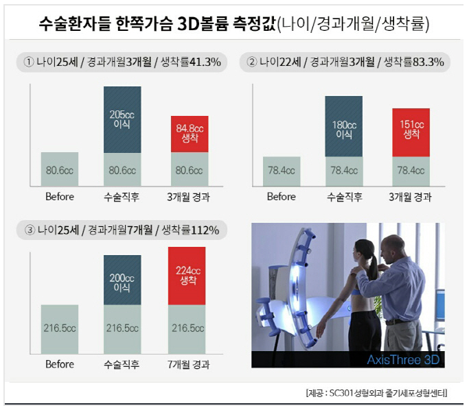 가령 최근 수술받은 22세 여성은 수술 후 3개월에 걸쳐 3D볼륨값을 측정한 결과 안정적인 생착률로 볼륨감을 유지하는 것으로 나타났다. 그는 왼쪽 가슴에는 170㏄를, 오른쪽 가슴에는 180㏄를 주입받았다. 줄기세포는 6,000만셀 이상 들어갔다.수술 전 왼쪽가슴의 볼륨 3D볼륨값은 65.1이었고 수술 후 1개월째에는 241로 급증, 수술후 3개월째에는 206으로 안정적인 가슴확대 효과를 유지하고 있다. 오른쪽 가슴은 78.4에서 시작, 1개월 째에는 252를, 3개월째에는 229.4를 기록했다. 결과적으로 180㏄를 이식한 오른쪽 가슴은 149㏄가 생착됐고 83.8%의 생착률을 보였다.